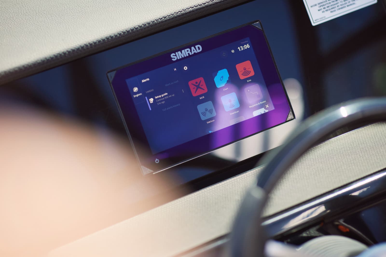 Tyylikäs mutta käytännöllinen runabout-vene tarjoaa uudistetun ohjaamon, jossa on entistä avarammat tilat, ergonominen hallintapaneeli ja intuitiivinen ohjaamo, jossa kaikki on käden ulottuvilla.