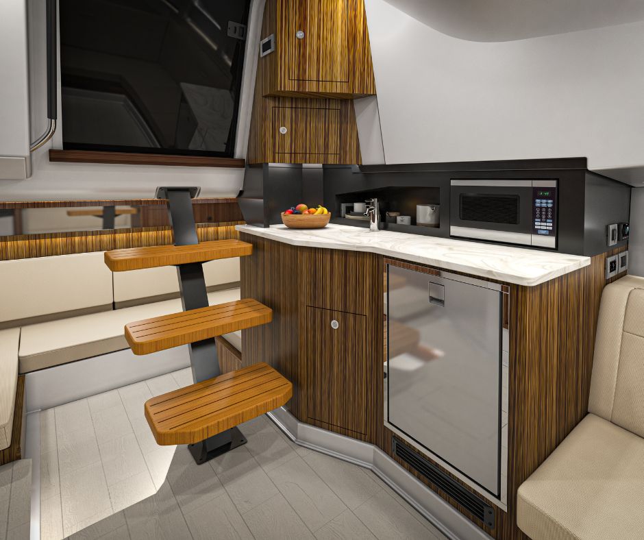 Tutki uusia rantoja päivän aikana ja rentoudu rauhassa illan tullen. Vene on tyylikkäästi sisustettu ja tarjoaa kutsuvat mukavuudet – täydellinen vesillä, olipa kyseessä iltapäivän irtiotto tai koko viikonlopun retki. Avotila on ihanteellinen brunssien tarjoiluun tai illalliskutsujen isännöintiin – varusteluun kuuluvat wetbar, suuri pöytä sekä lisävarusteina saatavilla oleva Kenyon-grilli, jääkaappi ja pöytä myös tähystäjän puolelle.